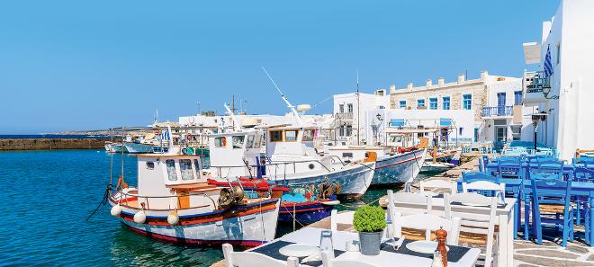 Head to the old port of Naoussa and see the impressive Venetian castle, or explore Parikia Town, the island's capital, known for its lush flowers, charming walkways and quaint shops. Settle in at any one of a number of seaside restaurants for fresh seafood and wine, and take in the island's beautiful sunset views.